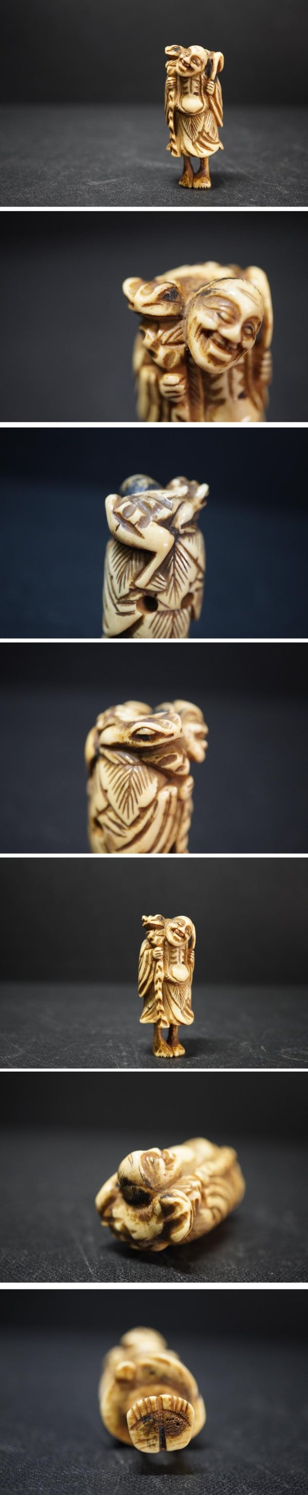 ご覧いただきありがとうございます。 古い根付 鹿角 [蝦蟇仙人] 形彫根付 堤物です。 擦れ、キズ、汚れ等ありますが、総じて状態は良好です。